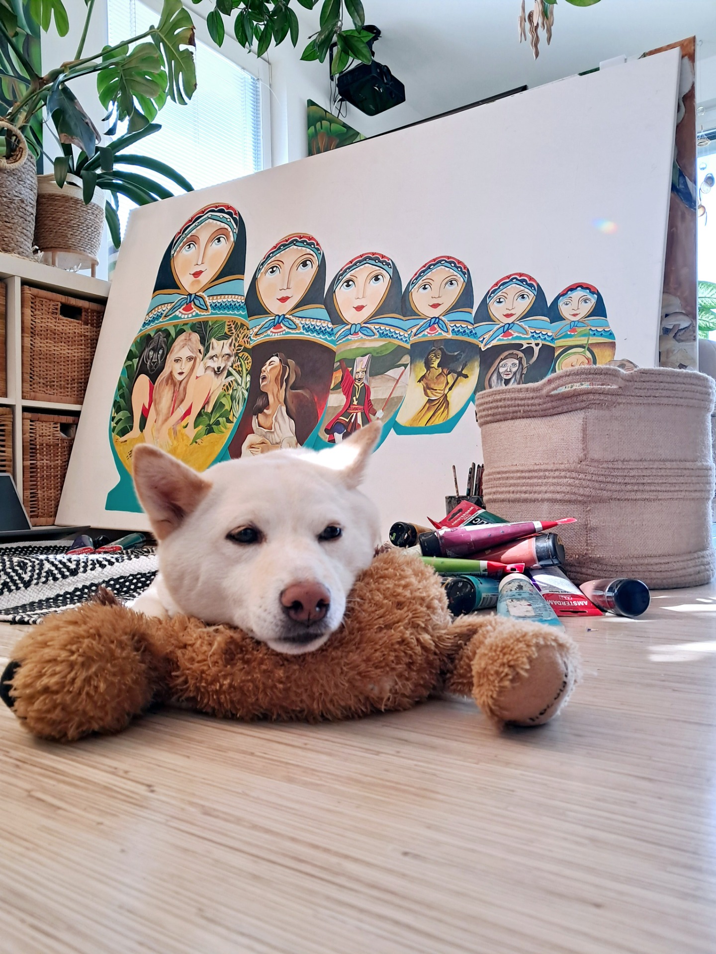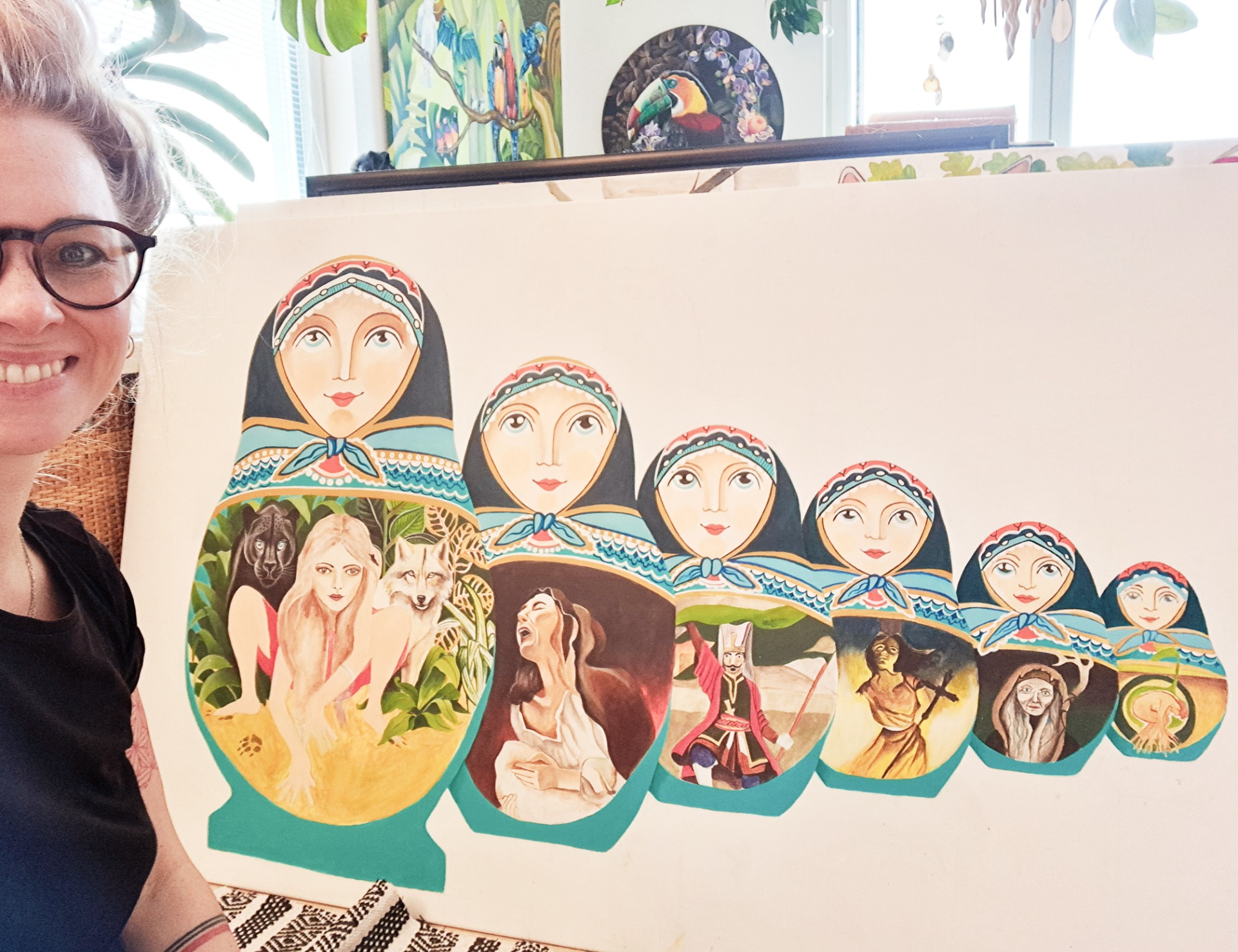 Námět tohoto obrazu dlouho dozrával v mé hlavě. Přemýšlela jsem, jak co nejjednodušším způsobem zachytit transgenerační přenos traumatu, buněčnou paměť a v neposlední řadě i odvážnější, ve společnosti stále kontroverzní, téma minulých životů. Věřím, že principem matrjošek se mi povedlo všechny tyto myšlenky uchopit najednou. Poselství obrazu bude fungovat, i když budete ochotni věřit pouze jedné z těchto teorií. Název odkazuje na již poměrně známý fakt, že naše zárodečné buňky byly přítomny v břiše (vaječnících) naší matky, když ona sama byla plodem v břiše její matky, tedy naší babičky. Vnímám to jako velmi důležitou skutečnost, kterou bychom si měli často připomínat. Zkoumání, jaké zásadní informace máme v buňkách nahrané po našich předcích, nám může pomoci odhalit naši skutečnou podstatu – kdo jsme, jaké jsou naše dary či prokletí.