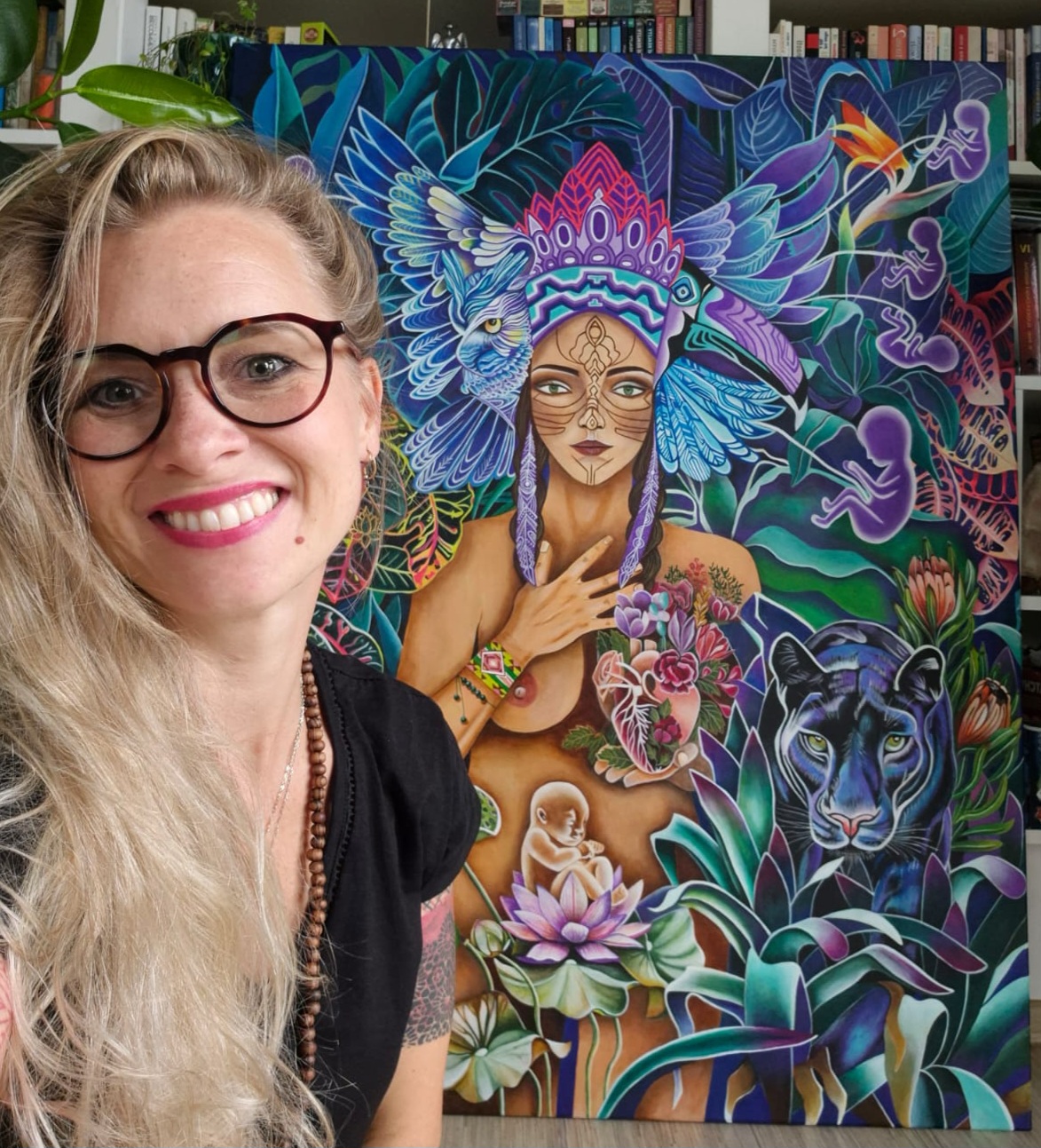 Tahle žena na obraze s otevřeným srdcem na dlani, s láskou a něhou vrací všechny děti rodu na své místo. Tahle žena už dokázala vyléčit své srdce a zbavit ho krunýře všech ochran a obran, kterými se v minulosti snažila ochránit svůj život. Zároveň se tak izolovala od lásky svých dětí a partnera a vlastně i od naplněného života.